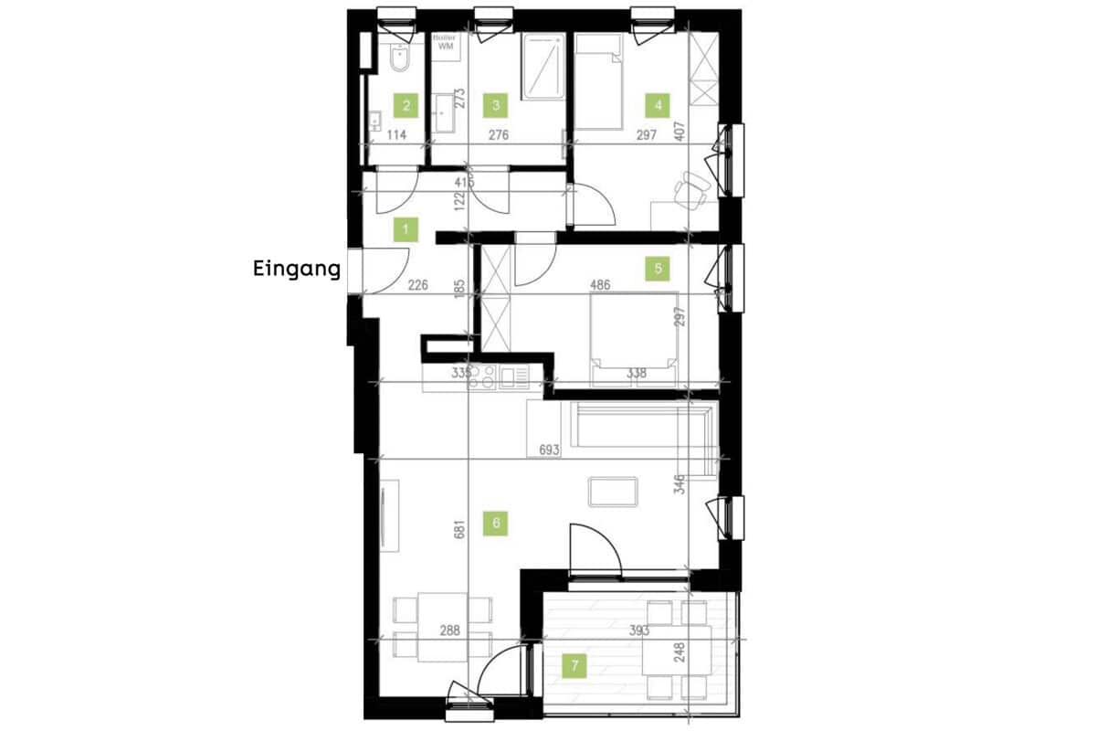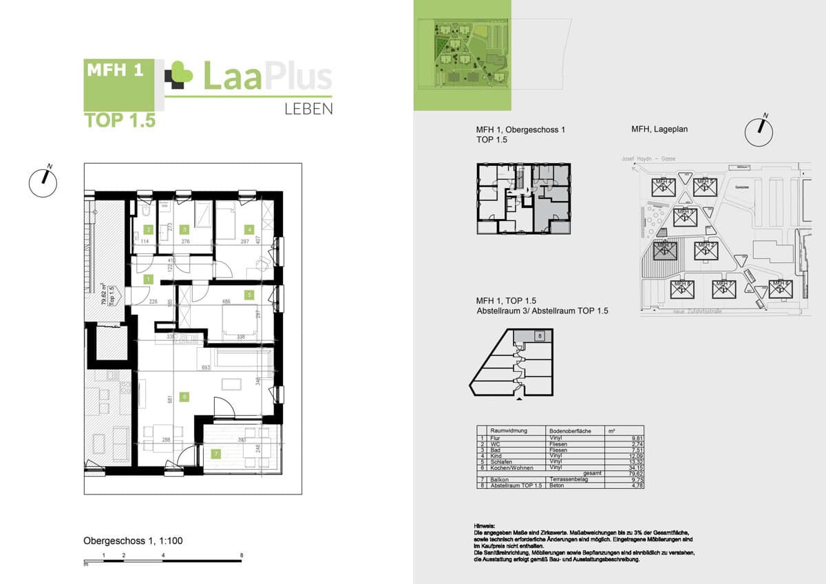 Auf ca. 79,62 m² Wohnfläche erwartet Sie ein durchdachter Grundriss mit einem großzügigen, offenen Koch- und Wohnbereich (ca. 34 m²), der viel Raum für individuelle Gestaltung lässt und bereits mit einer hochwertigen Küche ausgestattet ist. Zwei weitere Zimmer – ideal als Schlaf- und Arbeitszimmer oder für den Nachwuchs – bieten Rückzug und Flexibilität. Badezimmer und separates WC sind mit pflegeleichten Fliesen ausgestattet. Hochwertige Vinylböden ziehen sich durch die Wohnräume. Die großzügige Loggia mit ca. 9,75 m² erweitert Ihren Wohnraum nach draußen und lädt zum Verweilen ein. Abgerundet wird das Angebot durch ein ebenerdiges Abstellabteil (ca. 4,78 m²).