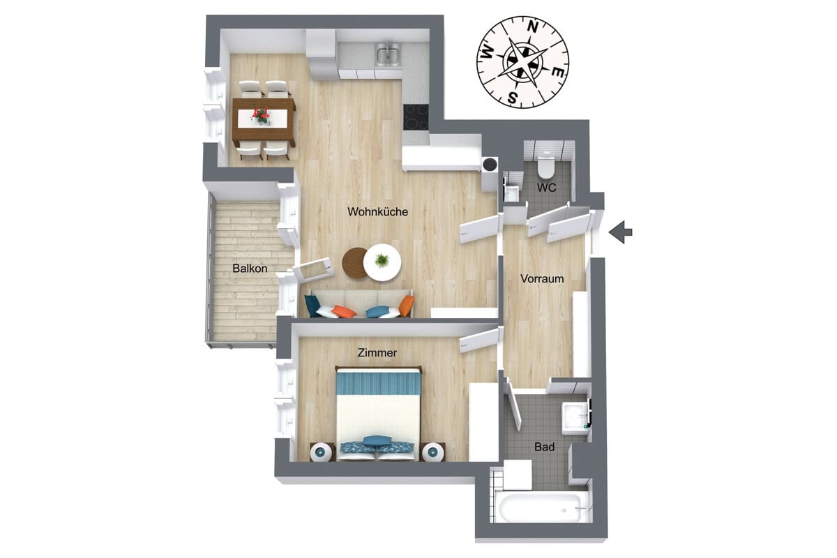 Der Wohnungsgrundriss ist optimal auf die stärkste Zielgruppe des Wiener Mietmarktes abgestimmt: junge Berufstätige, Studierende und Stadtpendler. Helle Räume, ein nach Westen und in den ruhigen Innenhof ausgerichteter Balkon, eine moderne Küche und ein eigener Stellplatz machen die Wohnung zu einem dauerhaft stark nachgefragten Mietobjekt.